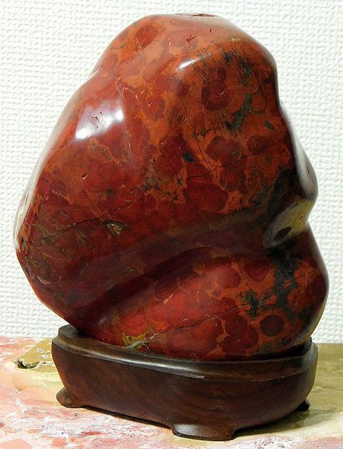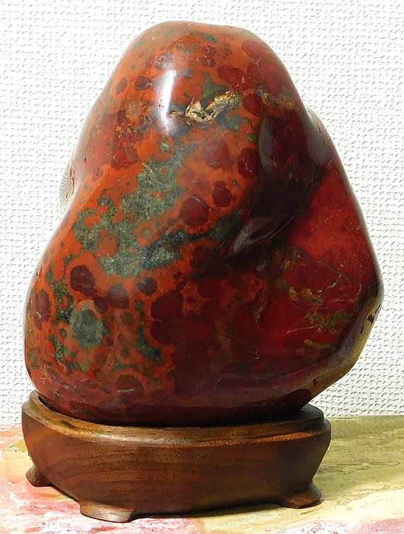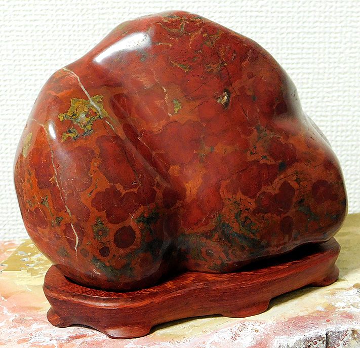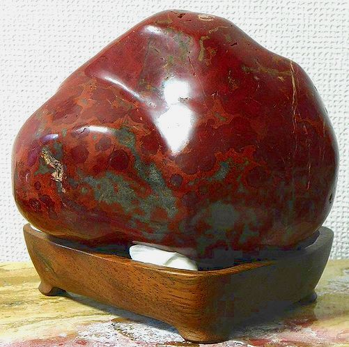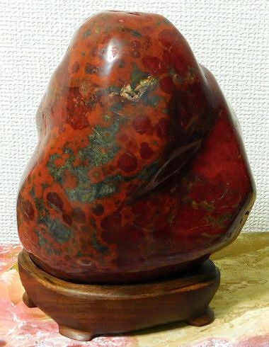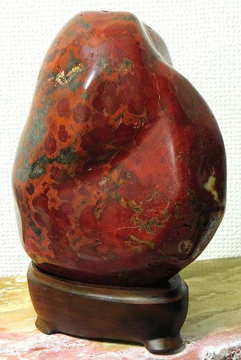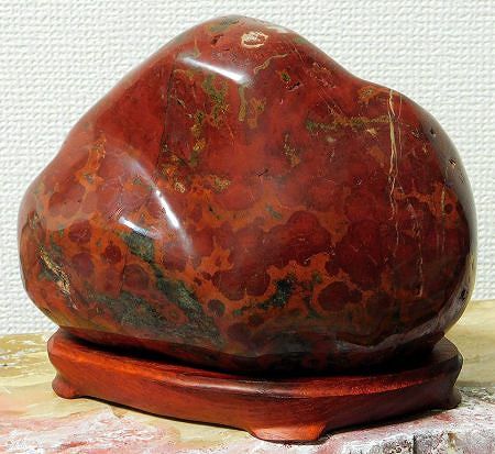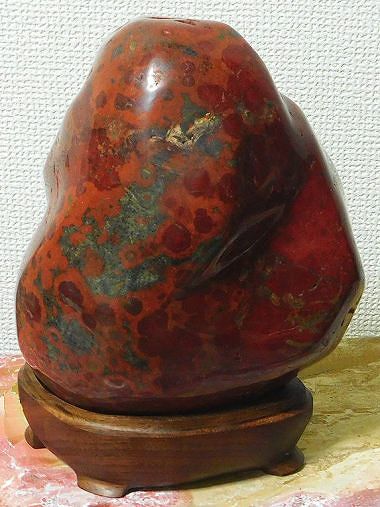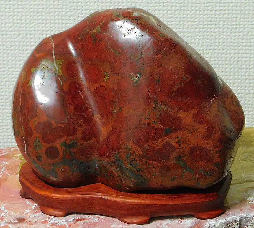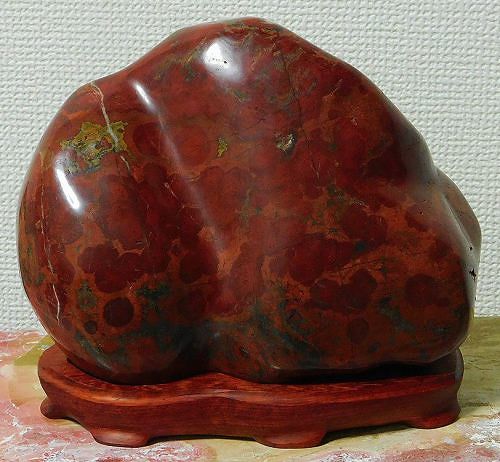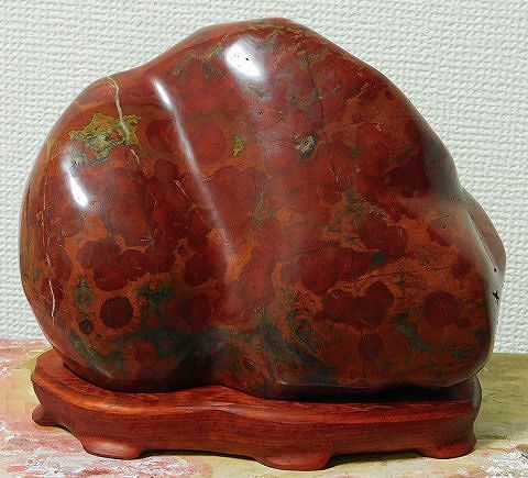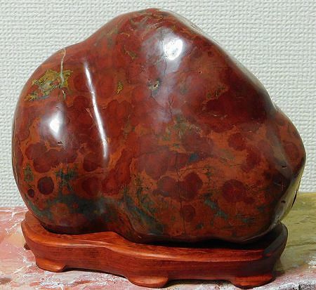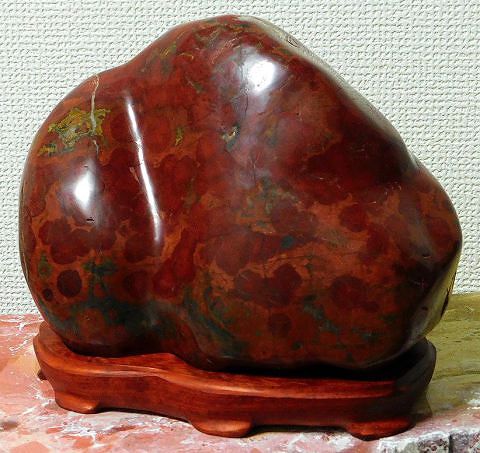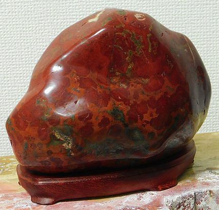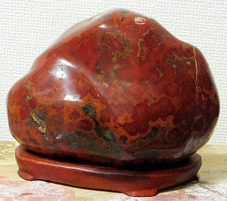 昼間の桜石の「ひまわり」 夜桜石の「ひまわり」 桜と菊と孔雀が共演する 激レアの桜石 銘「神代(かみよ)の桜」 横19×高さ(台込)16×奥8 3262g 台座は、本紫檀 ![]() 桜石の母岩に、孔雀石の母岩がくつっいて 変性した石だそうです 赤は、赤花菊花石 紫は、下のタイプの孔雀石 ![]() ![]() 裏には、菊がいる オレンジは、桜なのか菊なのかよくわからない中間的な存在 黄色は、菊なのか孔雀なのかよくわからない中間的な存在 ということです そもそも菊花石の黄色い花は存在しないはずなので 黄色は孔雀ということになりますが 形から言えば菊だと考えられます 桜の母岩と孔雀の母岩がくつっいて 変性しているので、このように 七里さんでも悩む花(紋様)がみられるということです なお、菊花石の愛好家から≪桜石の母岩≫ と呼ばれているこの石は、そもそも桜石と無関係なんだそうです この菊花石の母岩は、白木の桜石でなく 赤倉山で採れる御殿桜と呼ばれる石だそうです ちなみに、御殿桜とは 水谷さんからいただいたこの石 あと、下の石が≪御殿桜≫です いずれにしても本石は 白木の桜石に、赤花の菊が咲いていて さらに孔雀もある という激レア中の激レアの石です それと、これだと、桜が奥まってよく見えないので 台座を直してもらっています この台座(立てて飾る台座)は 表と裏 両面みれるようにつくったのだそうです 台座は、紫檀の最高級品 ホンジュラスローズウッド (薔薇の香りのする紫檀) まだ、直し前で、石をずらして置いています 一番の見どころは、右の桜ですが 「麗花」の花が入ることで一層美しくなっています 台座の直し完成 横13.5×高さ(台込)20.5×奥9.5 3262g 台座は、紫檀の最高級品 ホンジュラスローズウッド 銘「紅流しの桜」 横6.5×高さ(台込)13.5×奥5 437g 枝の入り方が絶妙 台座の材は、ブビンガ この石は、内部がかなりメノウ化されています 銘「古城の桜」 横6.5×高さ(台込)11.5×奥5 390g 台座の材は、ブビンガ 背 面 この石は、白木産ではなく 赤倉山産の「御殿桜」と呼ばれている母岩です 七里さん曰く、本来「御殿桜」とは 赤倉山の赤の母岩の桜石を言っていたそうですが 今日では、定義が曖昧で、花が良い石や花の大きいものが そう呼んだりされているようです なので、そうした曖昧な言葉ではなく 桜石保存会として ちゃんと一つ一つの花に名前をつけた という経緯があります それはともかく、この御殿桜は 特別、花がおもしろいです 銘「霊樹の桜」 横12×高さ(台込)13×奥6 990g 台座の材は、ブビンガ ![]() 色が赤とオレンジの半々になっている珍しい花弁 桜の霊樹が見られます 桜石は、ジャスパーに近ですが とは言え、石質だけでいくと、五城目孔雀にはかないません しかし、五城目孔雀の判断基準が、綺麗さと大きさだけなのに対し 桜石は、日本の風景、情緒を表現できる石です 門司の梅花なども、幹や枝があって、景色を描く石ですが 桜石には色彩があります それに門司梅花は、そんなに花の種類がありません また、岐阜の菊花石は 華やかで、豪華ですが 柔らかい石なので、石質という点においては劣ります それに、菊花石は花が大きいだけに景色を表現するには ある程度、大きさのある必要があります これに対し、桜石は小さな石でも 景色や情緒を表現しうる稀有な存在と言えるわけです 銘「錦秋もみじ」 横7×高さ(台込)5.5×奥2.5 94g 台座の材は、黒檀 もみじの花は、樋(ひ)が薄く、仕上げるのが難しいそうです また、大きな原石を磨いていくと 突然、もみじの花が出てくるというものではないそうです ![]() 桜石というのは、このように層状になっていて 原石がどけだけ大きくても、もみじの層が入っていないと もみじは出てこないそうです なお、この原石から七里さんが磨き出したのが 「もみじ三色咲き」です ![]() この石は、私らのあとの世代 次世代に美石界を担うエースの1人が購入されています ![]() こっちの石は、昔、もみじがこんなに出ないとは思わず ふつうに売ってしまったものだそうです 誰に売ったのかさえ覚えていない とのことでした ![]() ![]() このもみじも、横からみると 層状になっていることが分かります ちなみに この石は、もみじとしては大きく 12×10×5 1.04kg とあるので もみじの花というか葉も、大きかったと思われます いずれにしても、もみじの原石を探しに 七里さんが、桜石を収集なされてきた 古老の方を回ってくださっています 庭に置かれている石を、片っ端からひっくり返して 探してくださっています 七里コレクションの「翡翠」の 出所(出自)と掲載について 岐阜県には、菊花石、桜石、孔雀石をはじめ 土岐石、白山紋石などが産出することから 美石愛好家が多いそうです 岐阜県在住の美石コレクターは 糸魚川や、富山県の小矢部川あたりまでは 頻繁に採石に行かれるようです そんなことから 全国に名を轟かすレジェンドが幾人かいるらしく 私が入手した土岐の紋石、激レアのコランダムなんかも レジェンドの石だったものを